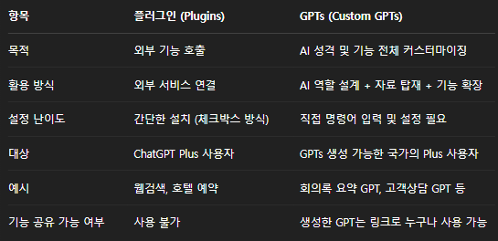 말하자면 플러그인이 ‘외부 기능’이라면, GPTs는 ‘내부 커스터마이징’에 더 가깝죠.