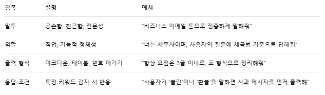GPT가 어떤 역할을 수행할지, 어떤 말투로 말할지, 어떤 형식으로 응답할지를 정확히 지정하는 것이 핵심이죠.